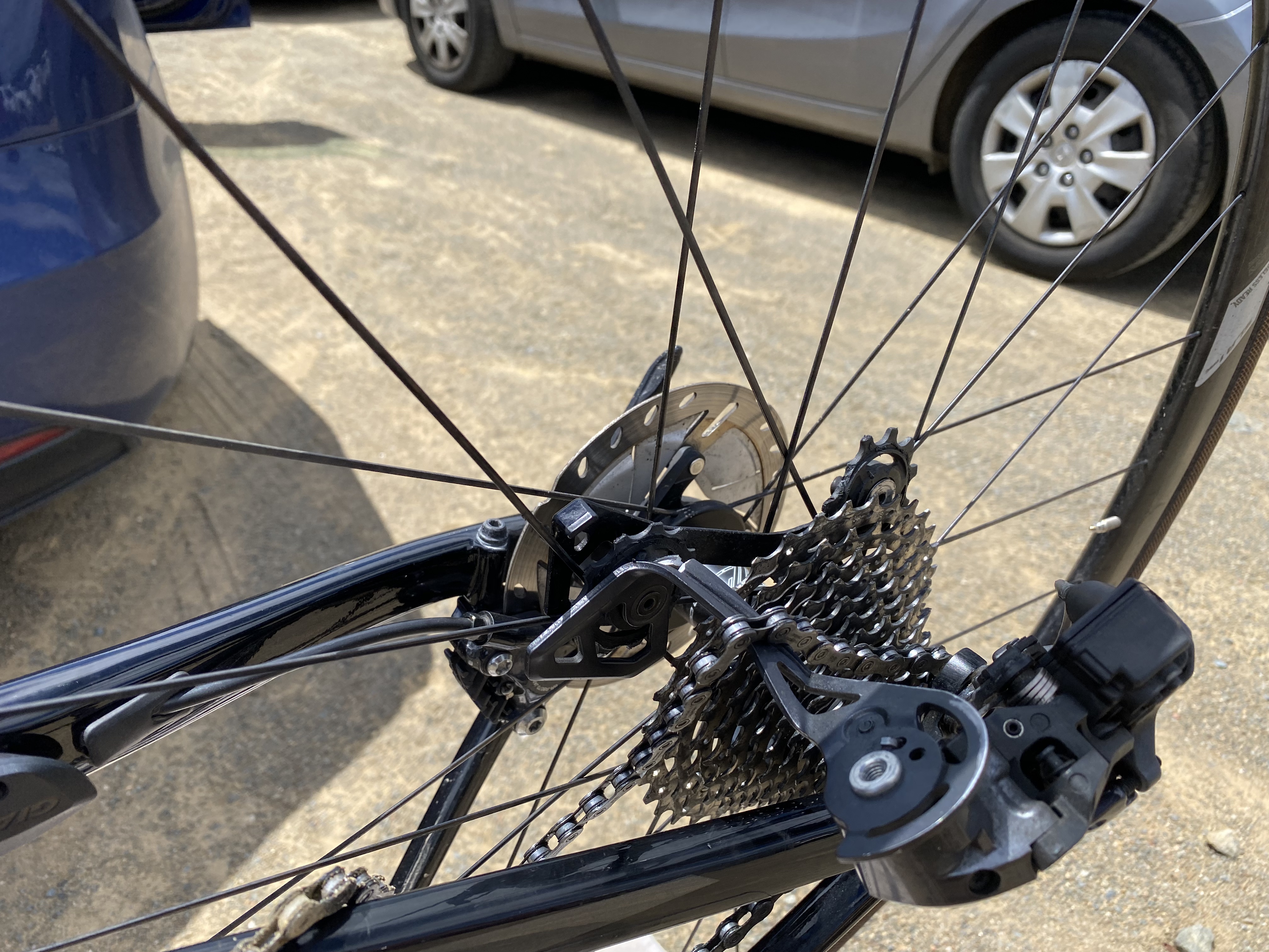 Result of a mashed rear dreailer while turning at Thara during Fitz's Challenge. The derailer was bent at rightangles and was caught under the rear cluster.